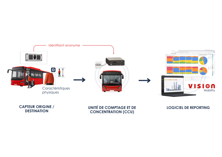 Les données collectées par les capteurs sont ensuite centralisées par l’unité de comptage et de concentration (CCU). Elles sont traitées et analysées dans le logiciel de reporting Vision Mobility d’Acorel, où des indicateurs détaillés sur les flux de passagers sont générés.